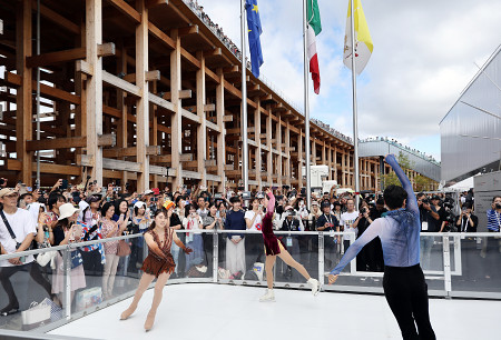 閉幕の日を迎えた大阪・関西万博のイタリア館前に、特設のスケートリンクが出現した。ミラノ・コルティナ冬季五輪のPRを兼ねた閉幕イベントで、関大アイススケート部の選手が演技を披露した=13日 【時事通信社】