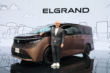 経営再建中の日産自動車は29日、2026年夏に国内で発売する高級ミニバン「エルグランド」の新型モデルを公開した。写真はジャパンモビリティショーで新型モデルと写真に納まるエスピノーサ社長。 【時事通信社】