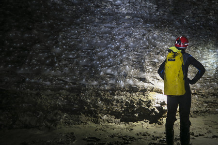 ギリシャとアルバニアの国境にある洞窟で、テニスコート半面に匹敵する巨大なクモの巣が発見された。約11万1000匹のクモが生息していたという(ジャン・フランソワ・フロ提供) 【AFP時事】