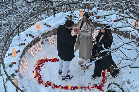 7日、ハンガリーの首都ブダペストの街並みを一望できる「ゲッレールトの丘」で、恋人に婚約指輪をはめる男性。雪景色が広がる中、キャンドルの明かりが恋人たちを温かく照らしている。 【AFP時事】