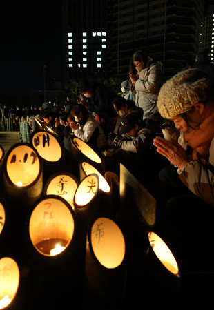阪神大震災から31年を迎えた17日、追悼行事が開かれた神戸市中央区の公園「東遊園地」には、早朝から多くの人々が訪れた。 【時事通信社】