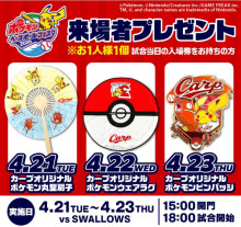 来場者プレゼントは日替わりで用意する。21日=カープオリジナル ポケモン丸型扇子、22日=同ウェアラグ、23日=同ピンバッジ。各日来場者1人につき1点配布する。