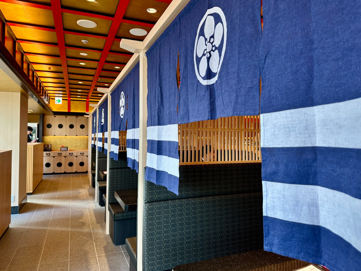 通路と座席をのれんで仕切る8人掛けのテーブル席は4卓設ける