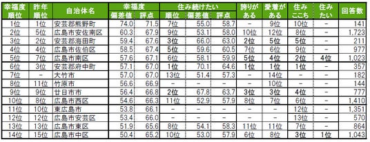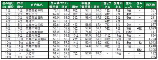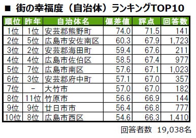 ■街の幸福度(自治体)トップは、2年連続で安芸郡熊野町