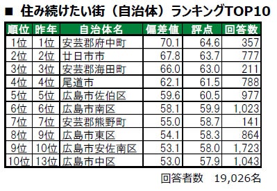 安芸郡熊野町が唯一偏差値70台の高い評価を得て、2年連続で1位に輝きました。2位は昨年5位から順位を上げた広島市安佐南区、3位は安芸郡海田町です。その他トップ10内では、昨年は偏差値50未満で順位非公開だった大竹市が、今年は7位にランクインしています。