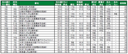 呉市に位置する安芸川尻が、唯一偏差値70台の高い評価を得て、初登場で1位に輝きました。安芸川尻は、昨年は累計回答数が30名未満でランキング集計対象外でした。2位は広島市安佐南区に位置する七軒茶屋(昨年6位)、3位は廿日市市に位置する山陽女学園前(昨年9位)で、いずれも昨年より順位を上げてトップ3入りしています。その他昨年より大きく順位を上げてトップ10入りしたのは、5位宮内A(昨年24位)、8位宇品二丁目A(昨年21位)です。