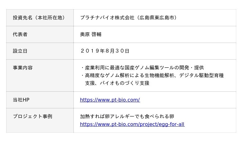 ちゅうぎんキャピタルパートナーズ(岡山市 代表取締役 岡田 浩幸)は、スタートアップ企業を出資対象とする「ちゅうぎんインフィニティファンド3号」を通じて、プラチナバイオ株式会社(広島県東広島市 代表取締役CEO 奥原 啓輔、以下、プラチナバイオ)の第三者割当増資を引受けました。