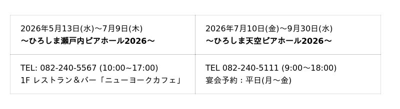 前半は1階レストラン&バー「ニューヨークカフェ」にて、広島や瀬戸内の食材を取り入れた料理を楽しめる「ひろしま瀬戸内ビアホール2026」を開催。後半は23階宴会場「ムーングロー」に会場を移し、広島の夜景を眺めながら楽しむ 「ひろしま天空ビアホール2026」 を開催予定。後半の料理内容やテーマの詳細は後日発表いたします。