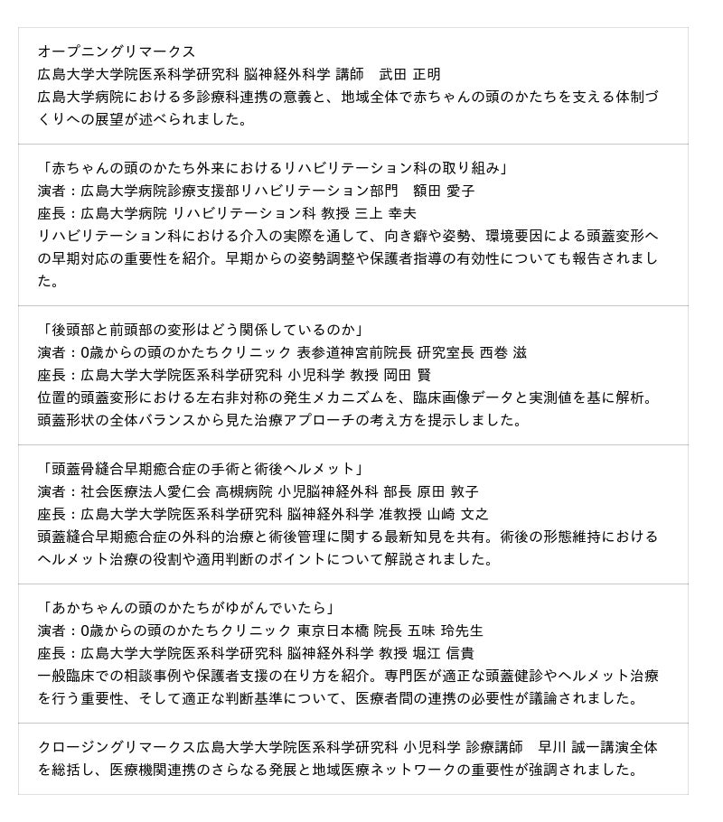 広島小児神経セミナー2025には全国各地から約100名の先生方にご参加いただき、小児頭蓋変形をめぐる多角的な議論が交わされました。診療科の枠を越えて知見を共有し合うことで、診断・治療のみならず発達支援やご家族へのサポートまで視野を広げた医療体制の重要性が改めて示されました。本セミナーが各地域での連携のモデルとなり、より質の高い小児医療の発展につながることを期待しています。