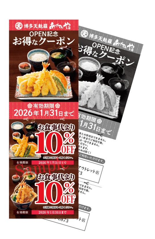 春夏秋冬、季節ごとの旬の素材をサクッと香ばしく揚げた天ぷらが自慢の「あげてんや」では佐賀鳥栖プレミアム・アウトレット店を10月23日(木)にグランドオープンいたします。佐賀県では初出店となります。「博多」をコンセプトにした運営スタイルで定食もしくはセットメニューでは「明太子とからし高菜」食べ放題でございます。そして、今回はオープン特別記念プレゼントとして「お得なクーポン券(10%OFF)」をご来店いただきましたお客様に配布いたします。どうぞ、この機会にご利用ください。皆様のご来店をスタッフ一同お待ちしております。何卒よろしくお願い申し上げます。