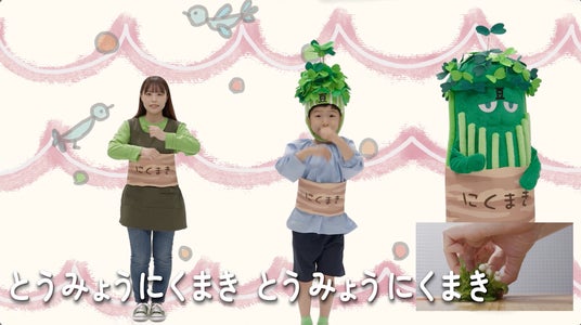 とうみょんが、男の子「はるくん」と「せんせい」と3人で「とうみょうにくまき隊」を結成。豆苗のテレビCMにも使用しているオリジナルソングに合わせてダンスを踊ります。「とうみょうにくまき」の歌詞で両手を胸の前でグルグル回す振り付けや、「村上農園 とうみょう」の歌詞で上に大きく伸びる振り付けなど、お子さまでも真似しやすいキャッチーなダンスになっています。