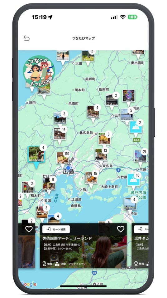 「つなたびマップ」は、つなたび氏が実際に訪れた中国地方の絶景・カフェ・グルメ・体験を、写真・動画でピンとして地図上にドロップ。ピンにはInstagram記事へのリンクを掲載して記事と完全連動しています。見て終わる旅ではなく、「SNSで見た“あの場所”に行ける!」を提案します。