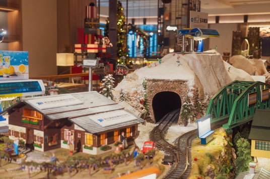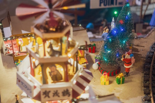今年のクリスマス・トレインは、昨年の全長8mから11mへとスケールアップ。雪山でスキーを楽しむ人々や、クリスマスマーケットで買い物をする家族など、冬のヨーロッパの風景がより豊かに描かれています。ジオラマの中には、街を訪れるサンタクロースの姿も。毎年、お子様たちが目を輝かせながらサンタを探す微笑ましい光景が広がります。繊細なミニチュアの世界を、色とりどりの貨車を連ねた列車が走り抜ける様子は、まるで夢の中のよう。思わず足を止めて見入ってしまう、心温まるひとときをお届けします。