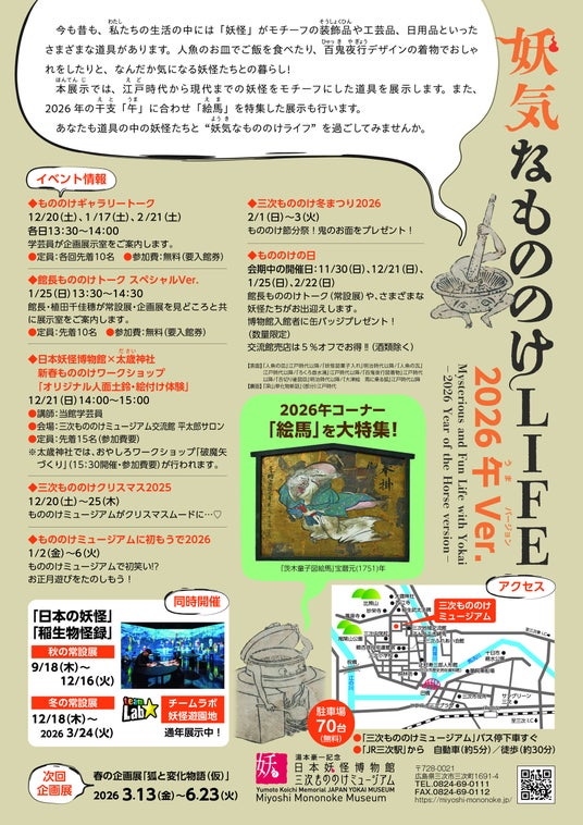 本展示では、江戸時代から現代までの妖怪をモチーフにした道具を展示します。また、2026年の干支「午(うま)」に合わせ「絵馬」を特集した展示も行います。