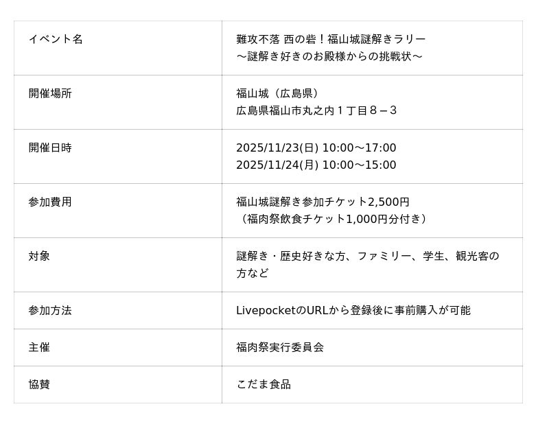 難攻不落の名城「福山城」で知恵比べ!「福肉祭2025 特別企画」お殿様からの挑戦状『福山城謎解きラリー』開催