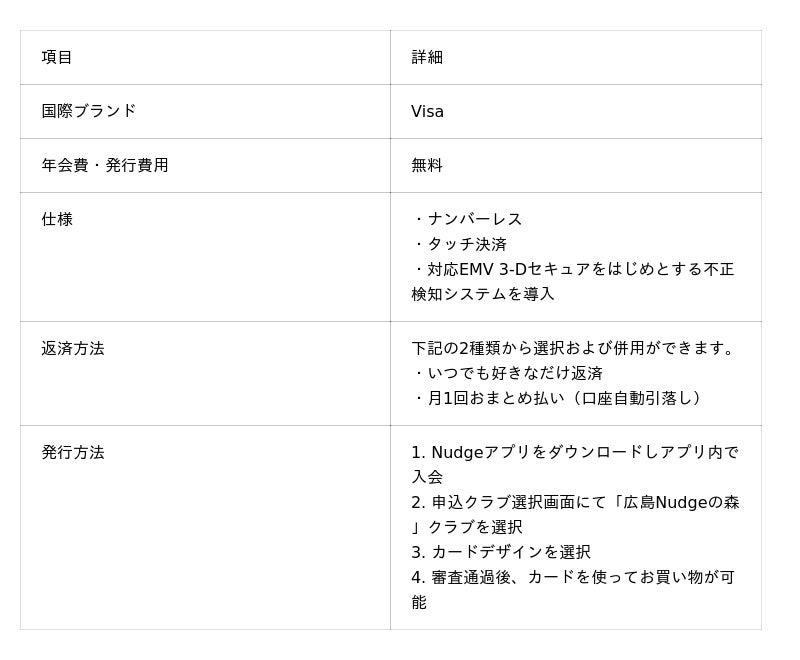 「広島Nudgeの森」とはナッジカード「広島Nudgeの森」クラブは、ナッジカードの利用額の一部が自動的に森林再生活動に還元される仕組みを持つ“地域応援型”のクレジットカードです。日常の買い物で本カードを利用すると、クラブ会員の総決済額10万円ごとに1本の苗木に相当する支援が「広島Nudgeの森」での植樹活動に充てられます。また、カード会員は、自身の累計利用額に応じて、広島県内の協賛企業が用意した限定特典を受け取ることも可能です。