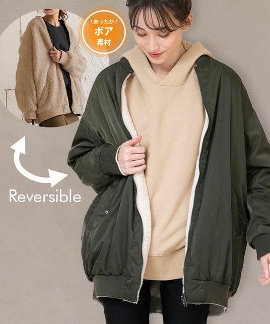 2.■ リバーシブルMA-1裏ボアブルゾンで“防寒×おしゃれ”次にご紹介するアウター、リバーシブルMA-1 裏ボアブルゾン。ミリタリー定番のMA-1デザインに、裏地を独自開発のボア仕様で真冬でも安心の暖かさ。着膨れしないのに保温性が抜群で、腰回りをすっぽり隠すので気になるヒップラインもすっきりカバーしてくれます。さらにリバーシブルで使えるというお得感。下に合わせるざっくり系のゆったりニットもダボつくことなく着こなせます。秋から冬にかけて「アウターどうしよう?」と迷ったとき、1枚で複数の表情を楽しめるのは嬉しいポイントです。例えば、表をミリタリーグリーンでカジュアルに、裏をもっとベーシックな色で大人っぽく、なんて着回しも可能。