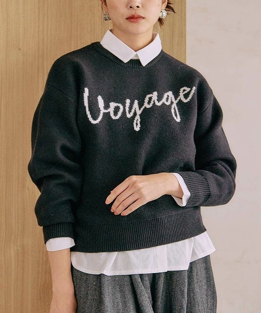 最後に、シンプルコーデに合わせやすい柄・ロゴニット。シンプルながらロゴでアクセントを効かせたアイテムは、1枚でも、重ね着でも活躍します。例えば、ジャケットのインナーに使って柄をチラ見せ、あるいはデニム×スニーカーで休日コーデに。無地のニットが定番・・・という方も少なくないはず。これではどこかトレンド感に欠け、老け見えの原因に。ロゴデザインもニットなのでロンTなどと比較すると若作りすぎず、大人っぽい印象で着こなしのハードルも低め。ベーシックだからこそ“使える”アイテムはこの冬のワードローブに必須のアイテム。