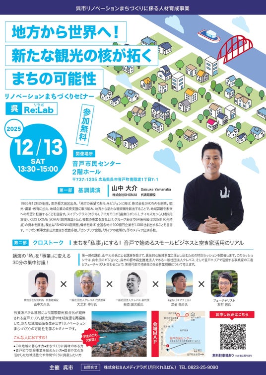本セミナーは、外資系ホテル建設により国際観光拠点化が期待される呉市音戸エリアの観光資源や地域資源を再編集し、新たな地域価値を生み出す「リノベーションまちづくり」の可能性を探ることを目的としています 。本事業は「呉市リノベーションまちづくりに係る人材育成事業」を株式会社エスエーホールディングス(本社:呉市・代表取締役:相川真太郎)傘下の株式会社SAメディアラボ(本社・代表取締役:同)が受託し運営しています。
