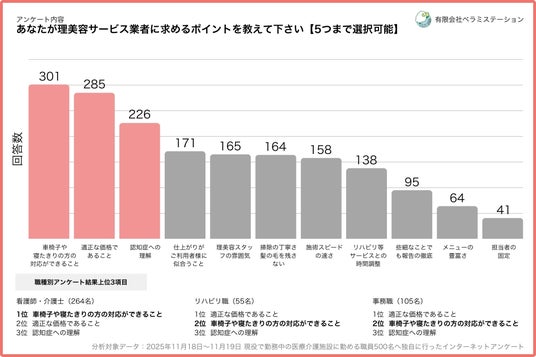 出張理美容サービスを展開する有限会社ベラミステーション(本社:広島県広島市中区鶴見町7-5 黒瀬ビル1F、代表取締役:小川 貴臣)は、医療介護現場で求められる理美容サービスのポイントを明らかにするため、全国500名の医療介護職員を対象にアンケート調査を実施しました。その結果、「車椅子・寝たきり対応」「適正な価格」「認知症への理解」が上位3項目となったことを報告いたします。