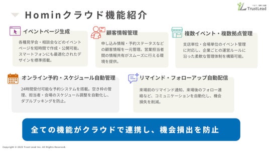 株式会社Trust Lead(本社:広島県広島市、代表取締役:江島和城)は、2025年12月1日、住宅会社向け集客プラットフォーム「Homin」において、イベントの企画から集客、予約管理、そして顧客フォローまでを一気通貫で支える「Hominクラウド」機能の提供を開始しました。
