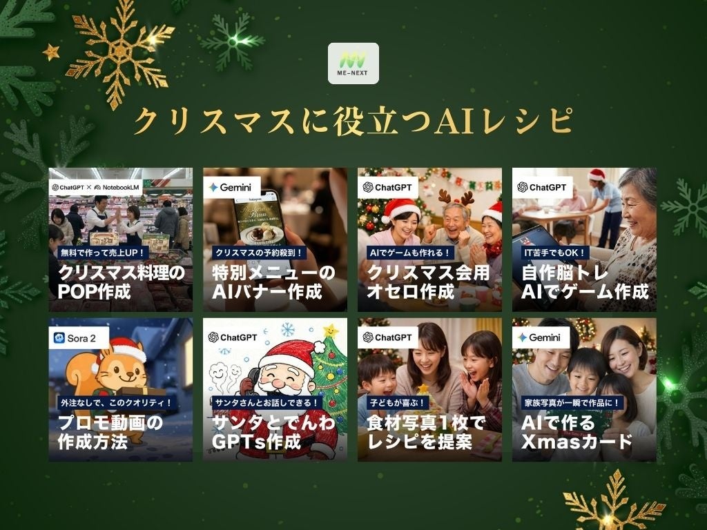 ミーネクストのクリスマス向け動画は、クリスマス直前でも無理なく取り入れられるよう、見てすぐ試せる1分構成で、現場対応に役立つ生成AI活用レシピとして構成しました。