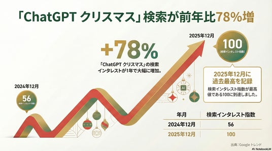 Google トレンド(日本国内)の分析によると、クリスマスシーズンに生成AIを活用しようとする検索行動が、2025年12月に過去最高値を記録しています。