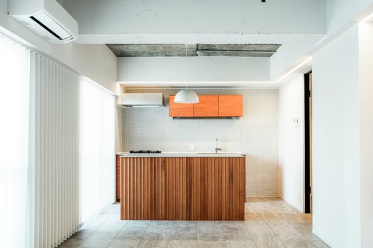 LDKや寝室の床には、近年お客さまからの人気が高まっているフロアタイルを採用しました。洗練された印象を与えながら、お手入れが簡単、かつコストも抑えられる素材です。天井は躯体のコンクリートをそのまま活かし、インダストリアルな雰囲気に。バーチカルブラインドや木目のアクセントを組み合わせ、無機質さと温かみが調和したホテルライクな空間を実現しています。