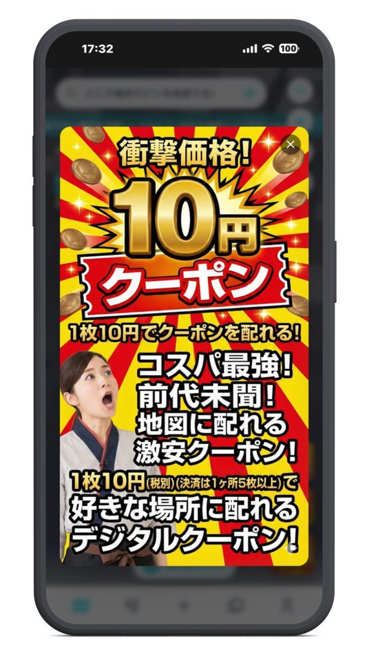 1枚10円(税別)でクーポンを発行100m以内に近づくことで取得可能実際の来店や回遊を促進します。