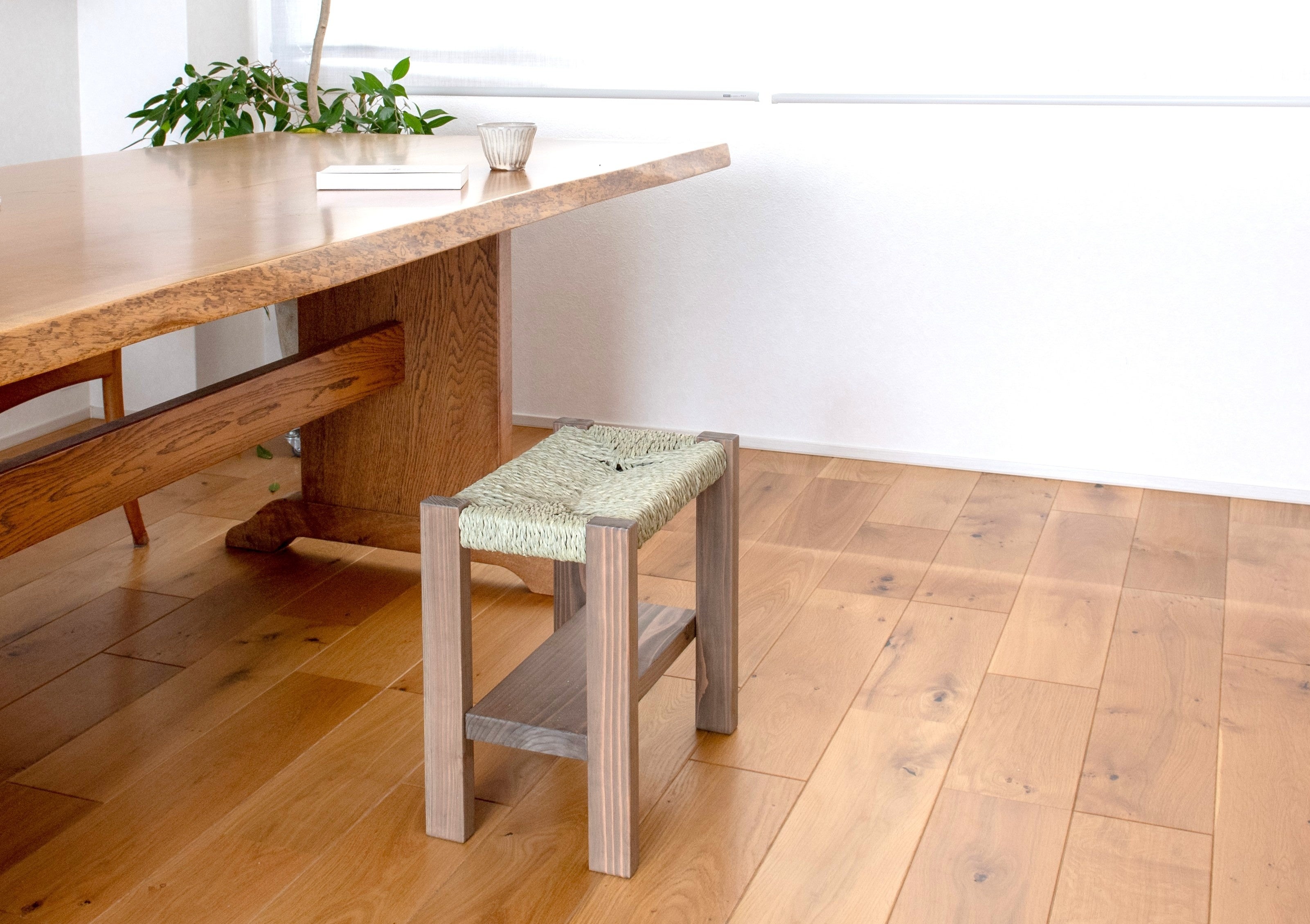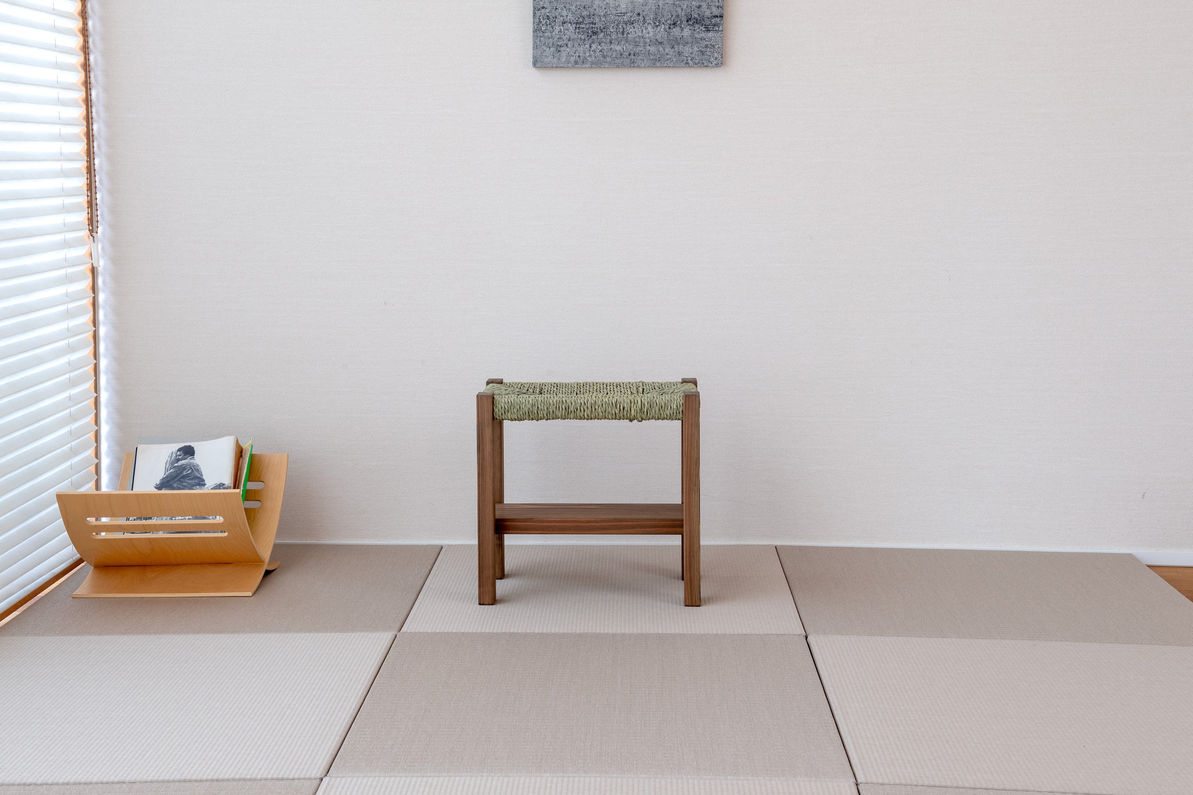 廃棄されていたい草の端材を紐に加工して編み上げた座面。通気性が高く、蒸れにくい構造。