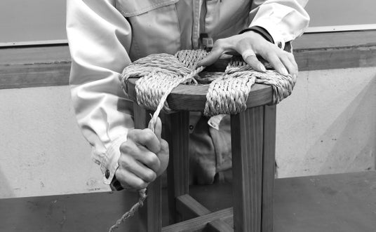 自社製造のフレームにい草の紐を編み込む工程。職人の手作業で丁寧に仕上げています。