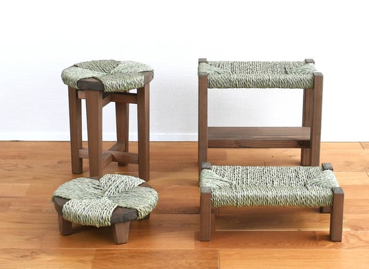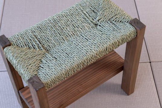 本製品は、畳の材料として使用される「い草の端材」を紐状にして編み上げた座面が特長です。