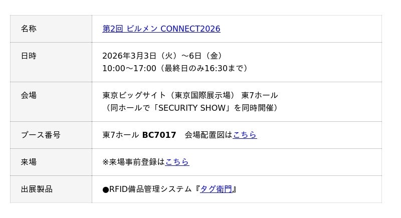 株式会社ハイエレコン(本社:広島県広島市西区、代表取締役社長:上田 康博)は、自社製品のRFID備品管理システム『タグ衛門』を、2026年3月3日(火)~6日(金)の間、東京ビッグサイトで開催される【ビルメンCONNECT2026】に出展いたします。