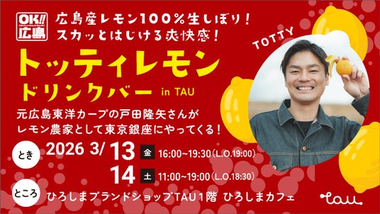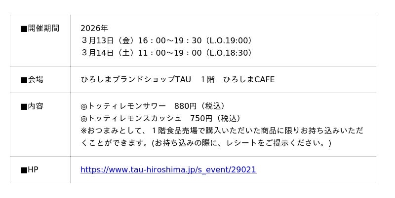 ひろしまブランドの発信拠点「ひろしまブランドショップ TAU」(以下「TAU」)では、3月13日から14日までの2日間、「トッティレモンドリンクバー in TAU」を開催します。