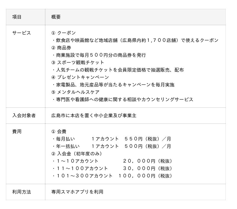 本事業は、広島市内の中小企業で働く勤労者およびその家族を対象に、福利厚生サービスを提供することにより、勤労者福祉の向上および中小企業の雇用の安定を図ることを目的とした、公共性の高い共済事業です。