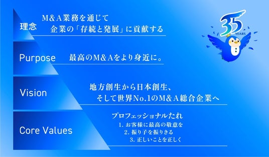 日本M&Aセンターは1991年の創業以来、「M&A業務を通じて企業の存続と発展に貢献する」ことを企業理念に掲げ、創業以来累計10,000件を超えるM&Aを支援してまいりました。35周年を迎えるにあたり、お客様、お取引先の皆さま、関係者の皆さまに深く感謝申し上げます。日本M&Aセンターは創業35周年を「第二創業」の機会と位置付け、さらなる事業基盤の強化と提供価値の向上に引き続き取り組んでまいります。